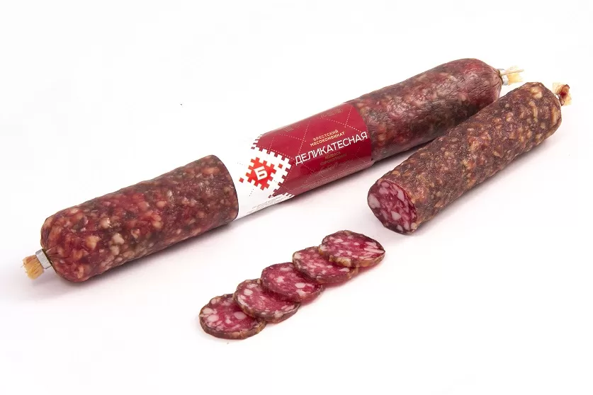 Колбаса сырокопчёная «Деликатесная» обладает мягким вкусом с идеально сбалансированным содержанием специй. Сырокопченая колбаса — продукт любимый многими. Обязательный гость праздничного стола, а некоторые не представляют завтрак без нее. Пряный аромат, умеренная жирность и разнообразие вкусовых оттенков завоевали любовь потребителей. Изготовленная с соблюдением технологии колбаса является деликатесом. Продукт замечательно вписывается в разные блюда, от бутербродов до нарезок.